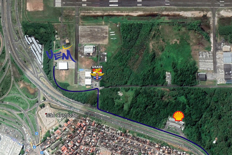 após o Posto Shell, virando à esquerda após a guarita de segurança e seguindo até o hangar.